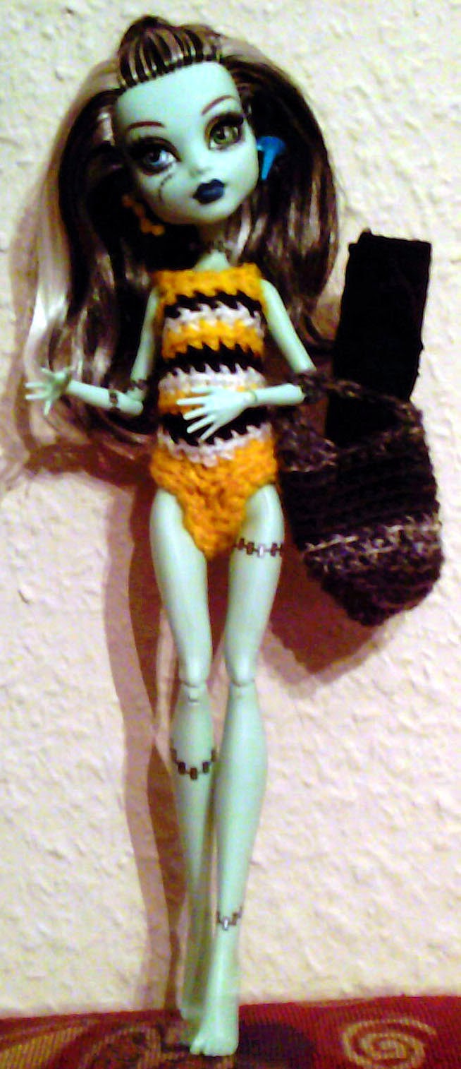 Here is my swimsuit, crochet in black, yellow and white, together with a grey striped crochet beach bag and fabric swimming towel.
