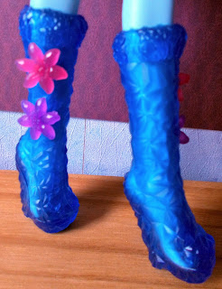 And here are Abbeys boots that match the collar and belt piece, are translucent blue and crystal again with a furry look at the top. Each of the boots has two holes to be decorated with accessorized.